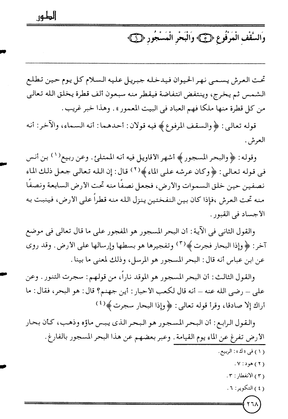 وَقَوله: {وَالْبَحْر الْمَسْجُور} أشهر الْأَقَاوِيل فِيهِ أَنه الممتلئ. وَعَن ربيع بن أنس فِي قَوْله تَعَالَى: {وَكَانَ عَرْشه على المَاء} قَالَ: إِن الله تَعَالَى جعل ذَلِك المَاء نِصْفَيْنِ حِين خلق السَّمَوَات وَالْأَرْض، فَجعل نصفا مِنْهُ تَحت الأَرْض السَّابِعَة وَنصفا مِنْهُ تَحت الْعَرْش، فَإِذا كَانَ بَين النفختين ينزل الله مِنْهُ قطرا على الأَرْض، فينبت بِهِ الأجساد فِي الْقُبُور.