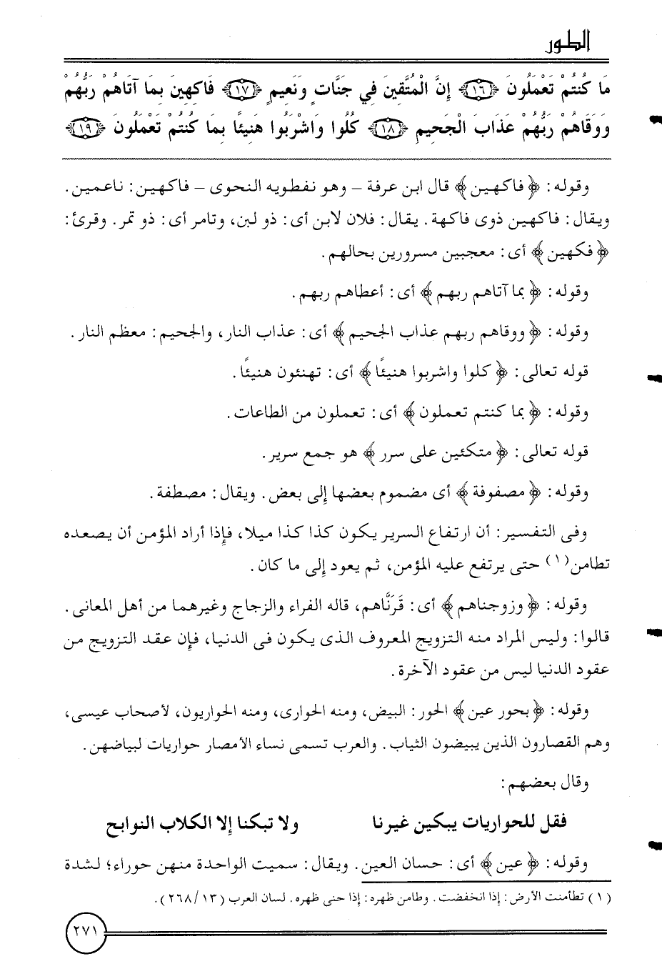 وَقَوله: {فاكهين} قَالَ ابْن عَرَفَة وَهُوَ نفطويه النَّحْوِيّ فاكهين: ناعمين. وَيُقَال: فاكهين ذَوي فَاكِهَة. يُقَال: فلَان لِابْنِ أَي: ذُو لبن: وتامر أَي: ذُو تمر. وَقُرِئَ: {فكهين} أَي: معجبين مسرورين بحالهم.