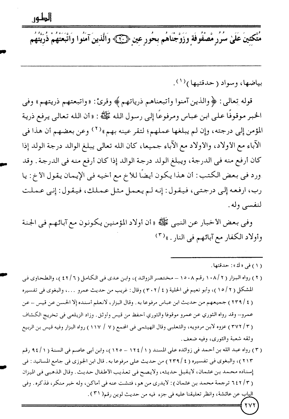 قَوْله تَعَالَى: {وَالَّذين آمنُوا وأتبعناهم ذرياتهم} وَقُرِئَ: " وَاتَّبَعتهمْ ذُرِّيتهمْ " وَفِي الْخَبَر مَوْقُوفا على ابْن عَبَّاس وَمَرْفُوعًا إِلَى رَسُول الله: " أَن الله تَعَالَى يرفع ذُرِّيَّة الْمُؤمن إِلَى دَرَجَته، وَإِن لم يبلغهَا عَمَلهم؛ لتقر عينهم بهم " وَعَن بَعضهم أَن هَذَا فِي الْآبَاء مَعَ الْأَوْلَاد، وَالْأَوْلَاد مَعَ الْآبَاء جَمِيعًا، كَأَن الله تَعَالَى يبلغ الْوَالِد دَرَجَة الْوَلَد إِذا كَانَ أرفع مِنْهُ فِي الدرجَة، ويبلغ الْوَلَد دَرَجَة الْوَالِد إِذا كَانَ أرفع مِنْهُ فِي الدرجَة. وَقد ورد فِي بعض الْكتب: أَن هَذَا يكون أَيْضا للْأَخ مَعَ أَخِيه فِي الْإِيمَان يَقُول الْأَخ: يَا رب، ارفعه إِلَى درجتي، فَيَقُول: إِنَّه لم يعْمل مثل عَمَلك، فَيَقُول: إِنِّي عملت لنَفْسي وَله.