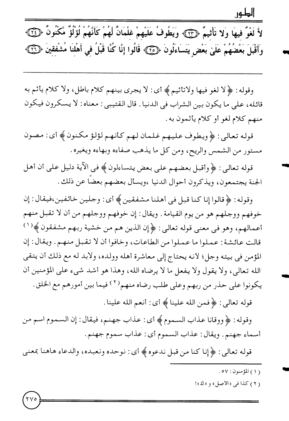 {لَا لَغْو فِيهَا وَلَا تأثيم} وَيَطوف عَلَيْهِم غلْمَان لَهُم كَأَنَّهُمْ لُؤْلُؤ منكون وَأَقْبل بَعضهم على بعض يتساءلون قَالُوا إِنَّا كُنَّا قبل فِي أهلنا فِي أهلنا مشفقين