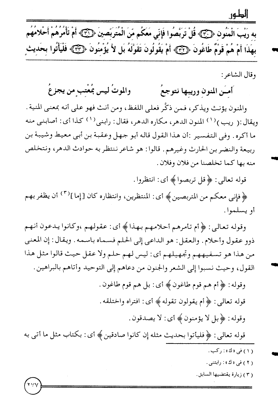 {بِهِ ريب الْمنون (30) قل تَرَبَّصُوا فَإِنِّي مَعكُمْ من المتربصين (31) أم تَأْمُرهُمْ أحلامهم بِهَذَا أم هم قوم طاغون (32) أم يَقُولُونَ تَقوله بل لَا يُؤمنُونَ (33) فليأتوا بِحَدِيث}