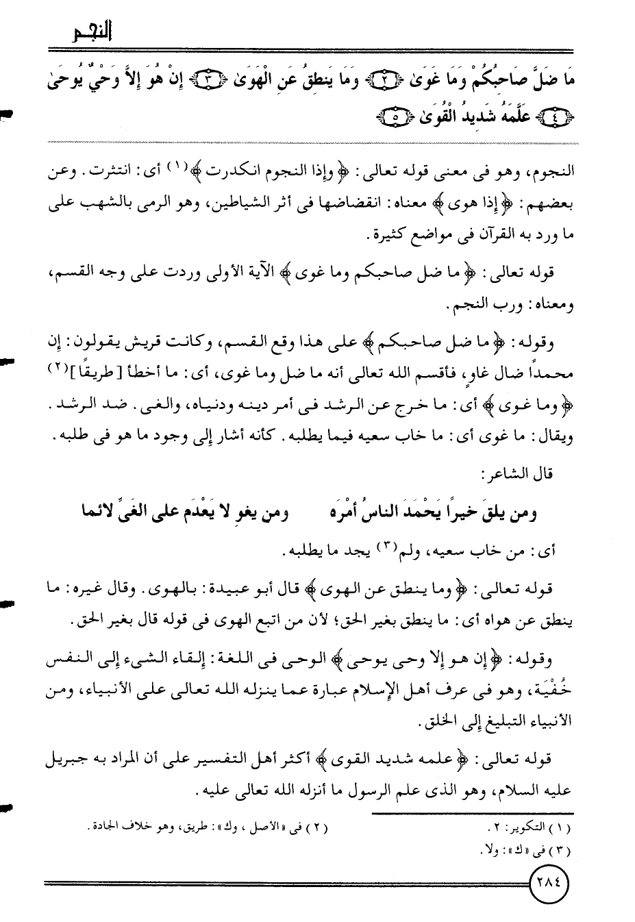 {مَا ضل صَاحبكُم وَمَا غوى (2) وَمَا ينْطق عَن الْهوى (3) إِن هُوَ إِلَّا وَحي يُوحى (4) علمه شَدِيد القوى (5) النُّجُوم، وَهُوَ فِي معنى قَوْله تَعَالَى: {وَإِذا النُّجُوم انكدرت} أَي: انتثرت. وَعَن بَعضهم: {إِذا هوى} مَعْنَاهُ: انقضاضها فِي أثر الشَّيَاطِين، وَهُوَ الرَّمْي بِالشُّهُبِ على مَا ورد بِهِ الْقُرْآن فِي مَوَاضِع كَثِيرَة.