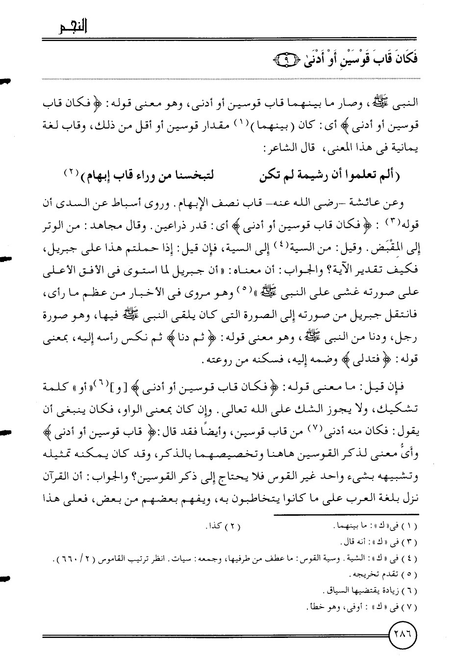 {فَكَانَ قاب قوسين أَو أدنى (9) النَّبِي وَصَارَ مَا بَينهمَا قاب قوسين أَو أدنى، وَهُوَ معنى قَوْله: {فَكَانَ قاب قوسين أَو أدنى} أَي: كَانَ (بَينهمَا) مِقْدَار قوسين أَو أقل من ذَلِك، وقاب لُغَة يَمَانِية فِي هَذَا الْمَعْنى، قَالَ الشَّاعِر: