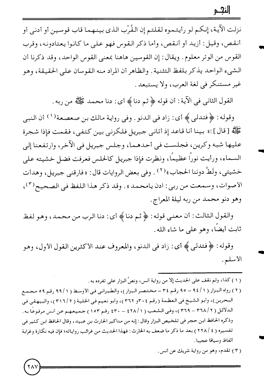 نزلت الْآيَة، إِنَّكُم لَو رَأَيْتُمُوهُ لقلتم إِن الْقرب الَّذِي بَينهمَا قاب قوسين أَو أدنى أَو أنقص، وَقيل: أَزِيد أَو أنقص، وَأما ذكر الْقوس فَهُوَ على مَا كَانُوا يعتادونه، وَقرب الْقوس من الْوتر مَعْلُوم. وَيُقَال: إِن القوسين هَاهُنَا بِمَعْنى الْقوس الْوَاحِد، وَقد ذكرنَا أَن الشَّيْء الْوَاحِد يذكر بِلَفْظ التَّثْنِيَة. وَالظَّاهِر أَن المُرَاد مِنْهُ القوسان على الْحَقِيقَة، وَهُوَ غير مستنكر فِي لُغَة الْعَرَب، وَلَا يستبعد.