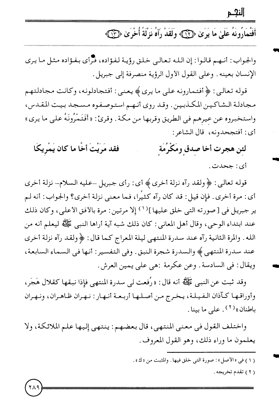 {أفتماروه على مَا يرى (12) وَلَقَد رَآهُ نزلة أُخْرَى (13) } وَالْجَوَاب: أَنهم قَالُوا: إِن الله تَعَالَى خلق رُؤْيَة لفؤاده، فَرَأى بفؤاده مثل مَا يرى الْإِنْسَان بِعَيْنِه. وعَلى القَوْل الأول الرُّؤْيَة منصرفة إِلَى جِبْرِيل.