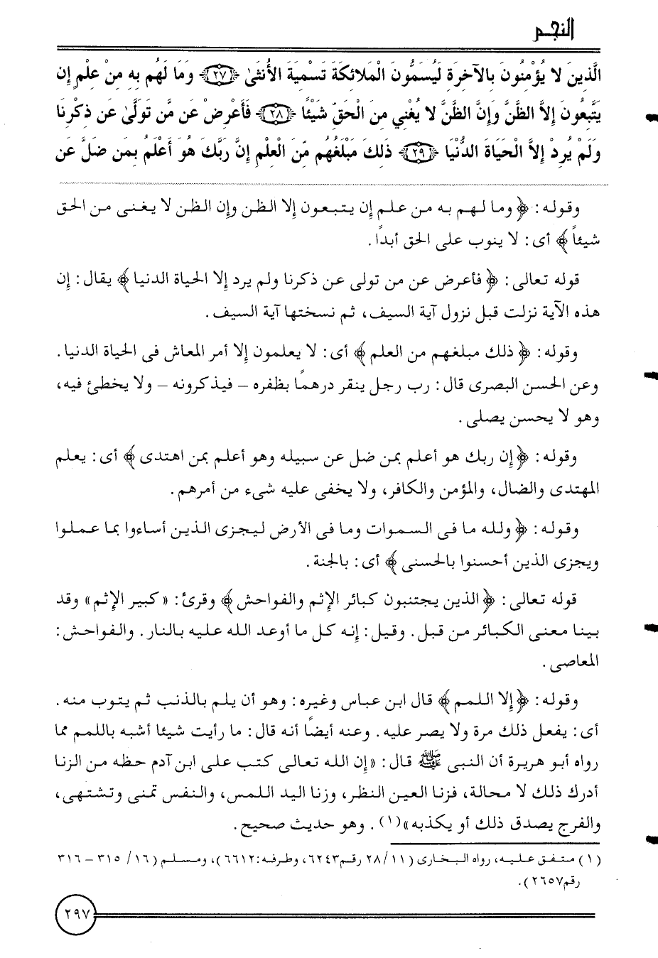 وَقَوله: {إِلَّا اللمم} قَالَ ابْن عَبَّاس وَغَيره: وَهُوَ أَن يلم بالذنب ثمَّ يَتُوب مِنْهُ. أَي: يفعل ذَلِك مرّة وَلَا يصر عَلَيْهِ. وَعنهُ أَيْضا أَنه قَالَ: مَا رَأَيْت شَيْئا أشبه باللمم مِمَّا رَوَاهُ أَبُو هُرَيْرَة أَن النَّبِي قَالَ: " إِن الله تَعَالَى كتب على ابْن آدم حَظه من الزِّنَا أدْرك ذَلِك لَا محَالة، فزنا الْعين النّظر، وزنا الْيَد اللَّمْس، وَالنَّفس تمنى وتشتهي، والفرج يصدق ذَلِك أويكذبه ". وَهُوَ حَدِيث صَحِيح.