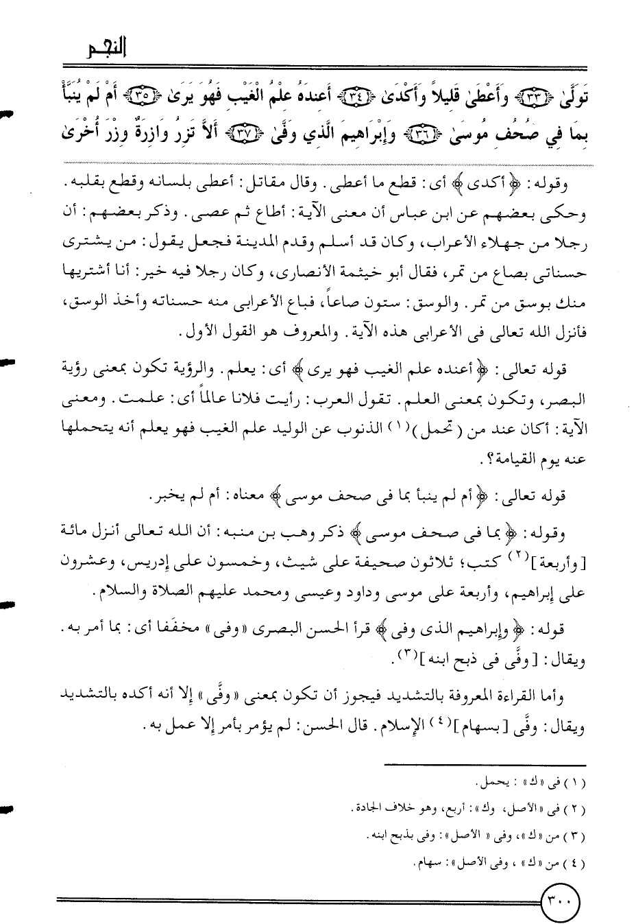 {تولى (33) وَأعْطى قَلِيلا وأكدى (34) أعنده علم الْغَيْب فَهُوَ يرى (35) أم لم ينبأ بِمَا فِي صحف مُوسَى (36) وَإِبْرَاهِيم الَّذِي وفى (37) أَلا تزر وَازِرَة وزر أُخْرَى}