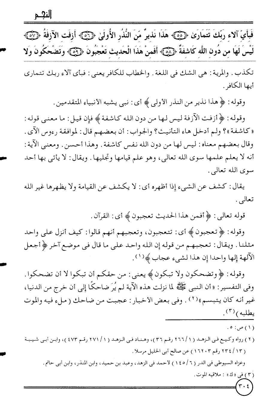 {فَبِأَي آلَاء رَبك تتمارى (55) هَذَا نَذِير من النّذر الأولى (56) أزفت الآزفة (57) لَيْسَ لَهَا من دون الله كاشفة (58) أَفَمَن هَذَا الحَدِيث تعْجبُونَ (59) وَتَضْحَكُونَ وَلَا} تكذب. والمرية: هِيَ الشَّك فِي اللُّغَة. وَالْخطاب للْكَافِرِ أَي: فَبِأَي آلَاء رَبك تتمارى أَيهَا الْكَافِر.