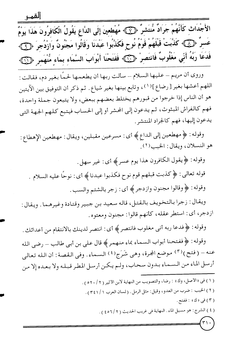 {الأجداث كَأَنَّهُمْ جَراد منتشر (7) مهطعين إِلَى الداع يَقُول الْكَافِرُونَ هَذَا يَوْم عسر (8) كذبت قبلهم قوم نوح فكذبوا عَبدنَا وَقَالُوا مَجْنُون وازدجر (9) فَدَعَا ربه أَنِّي مغلوب فانتصر (10) ففتحنا أَبْوَاب السَّمَاء بِمَاء منهمر (11)