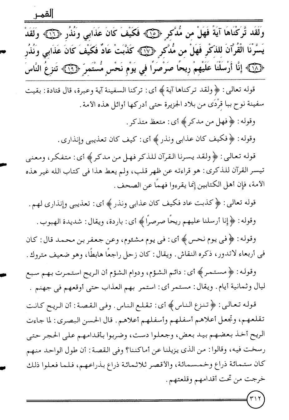 {وَلَقَد تركناها آيَة فَهَل من مدكر (15) فَكيف كَانَ عَذَابي وَنذر (16) وَلَقَد يسرنَا الْقُرْآن للذّكر فَهَل من مدكر (17) كذبت عَاد فَكيف كَانَ عَذَابي وَنذر (18) إِنَّا أرسلنَا عَلَيْهِم ريحًا صَرْصَرًا فِي يَوْم نحس مُسْتَمر (19) تنْزع النَّاس}