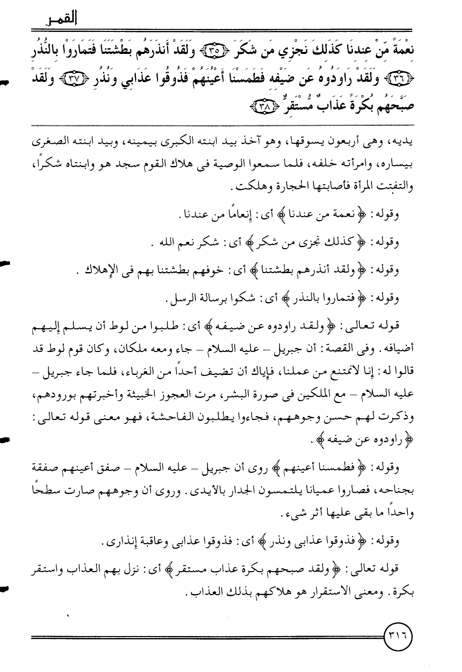 {نعْمَة من عندنَا كَذَلِك نجزي من شكر (35) وَلَقَد أَنْذرهُمْ بطشتنا فتماروا بِالنذرِ (36) وَلَقَد راودوه عَن ضَيفه فطمسنا أَعينهم فَذُوقُوا عَذَابي وَنذر (37) وَلَقَد صبحهمْ بكرَة عَذَاب مُسْتَقر (38) } يَدَيْهِ، وَهِي أَرْبَعُونَ يَسُوقهَا، وَهُوَ آخذ بيد ابْنَته الْكُبْرَى بِيَمِينِهِ، وبيد ابْنَته الصُّغْرَى بيساره، وَامْرَأَته خَلفه، فَلَمَّا سمعُوا الْوَصِيَّة فِي هَلَاك الْقَوْم سجد هُوَ وابنتاه شكرا، والتفتت الْمَرْأَة فأصابتها الْحِجَارَة وَهَلَكت.