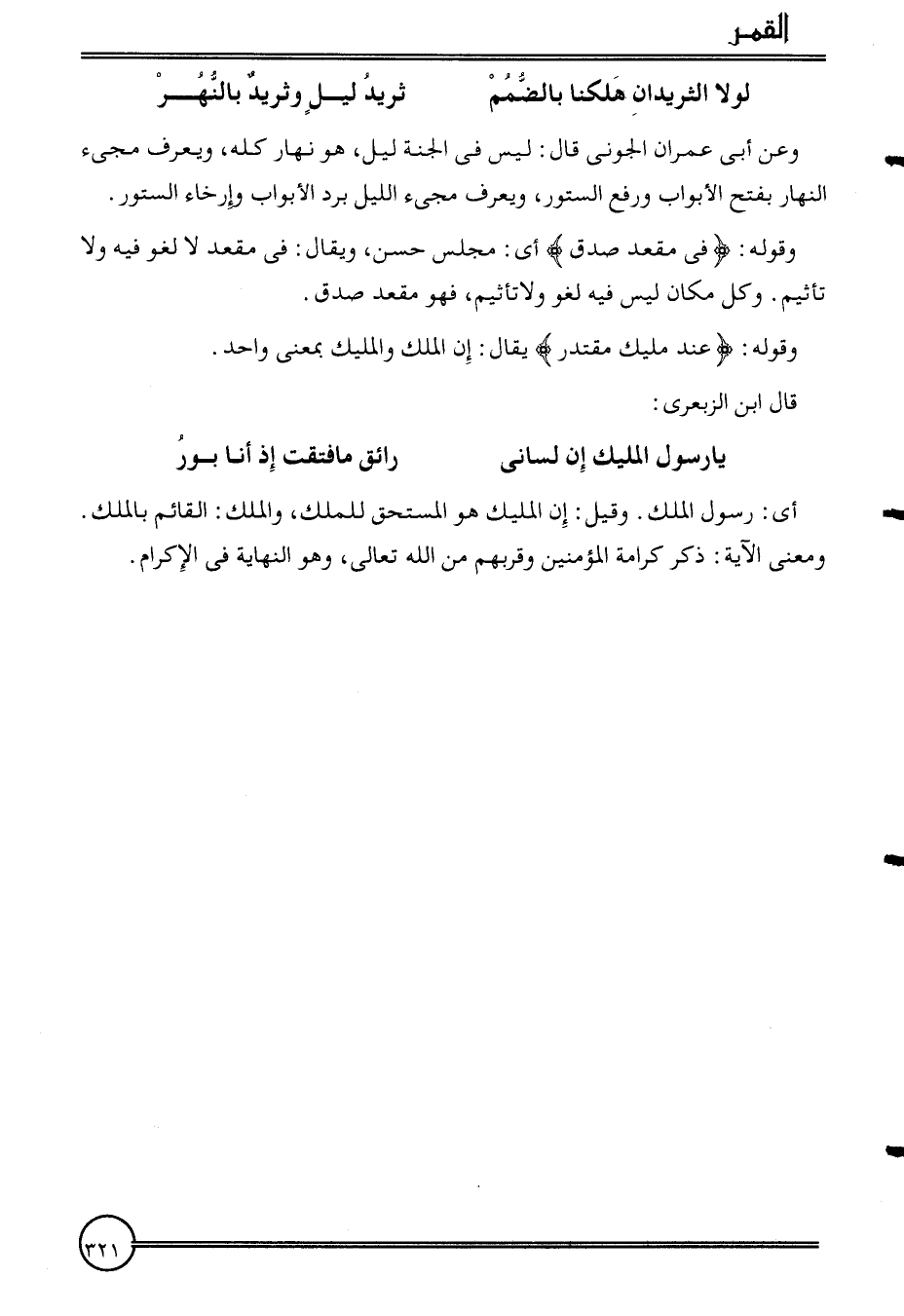 أَي: رَسُول الْملك. وَقيل: إِن المليك هُوَ الْمُسْتَحق للْملك، وَالْملك: الْقَائِم بِالْملكِ. وَمعنى الْآيَة: ذكر كَرَامَة الْمُؤمنِينَ وقربهم من الله تَعَالَى، وَهُوَ النِّهَايَة فِي الْإِكْرَام.