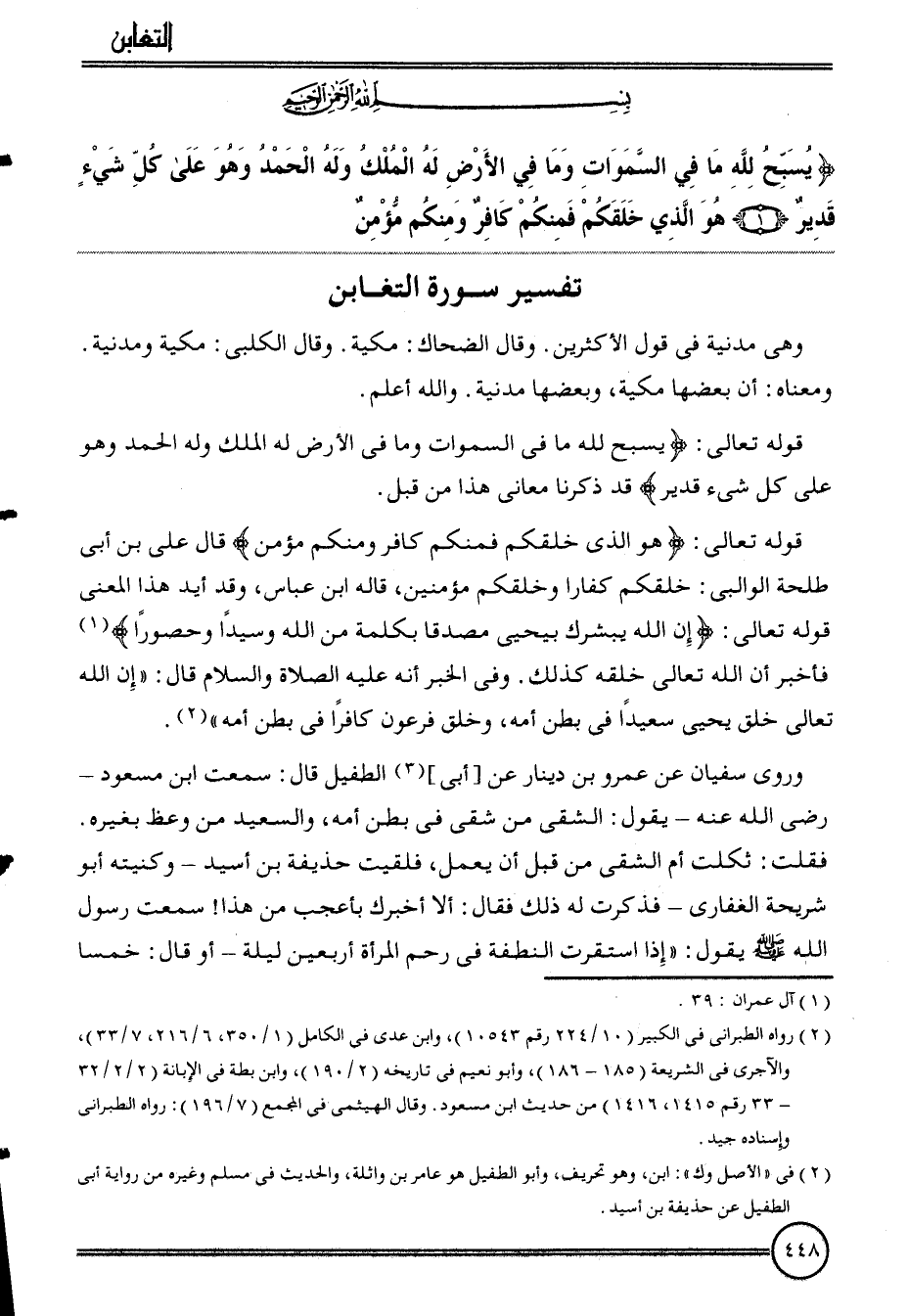 {يسبح لله مَا فِي السَّمَوَات وَمَا فِي الأَرْض لَهُ الْملك وَله الْحَمد وَهُوَ على كل شَيْء قدير (1) هُوَ الَّذِي خَلقكُم فمنكم كَافِر ومنكم مُؤمن}