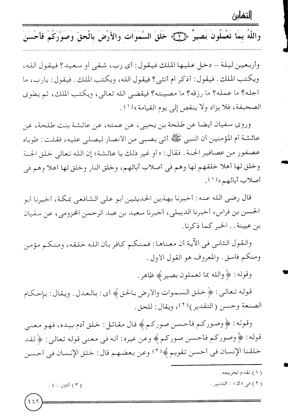 {وَالله بِمَا تَعْمَلُونَ بَصِير (2) خلق السَّمَوَات وَالْأَرْض بِالْحَقِّ وصوركم فَأحْسن} وَأَرْبَعين لَيْلَة دخل عَلَيْهَا الْملك فَيَقُول: أَي رب، شقي أَو سعيد؟ فَيَقُول الله، وَيكْتب الْملك. فَيَقُول أذكر أم أُنْثَى فَيَقُول الله وَيكْتب الْملك فَيَقُول: يَا رب، مَا أَجله؟ مَا عمله؟ مَا رزقه؟ مَا مصيبته؟ فَيَقْضِي الله تَعَالَى، وَيكْتب الْملك، ثمَّ يطوي الصَّحِيفَة، فَلَا يُزَاد وَلَا ينقص إِلَى يَوْم الْقِيَامَة ".