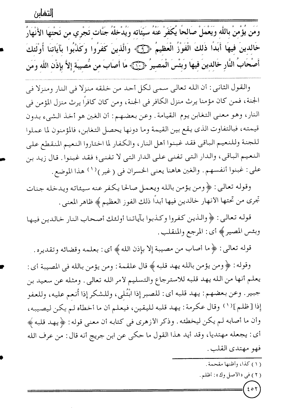 وَقَوله: {وَمن يُؤمن بِاللَّه يهد قلبه} قَالَ عَلْقَمَة: وَمن يُؤمن بِاللَّه فِي الْمُصِيبَة أَي: يعلم أَنَّهَا من الله يهد قلبه للاسترجاع وَالتَّسْلِيم لأمر الله تَعَالَى. وَمثله عَن سعيد بن جُبَير. وَعَن بَعضهم: يهد قلبه أَي: للصبر إِذا ابْتُلِيَ، وللشكر إِذا انْعمْ عَلَيْهِ، وللعفو إِذا [ظلم] وَقَالَ عِكْرِمَة: يهد قلبه لليقين، فَيعلم أَن مَا أخطأه لم يكن ليصيبه، وَأَن مَا أَصَابَهُ لم يكن ليخطئه. وَذكر الْأَزْهَرِي فِي كِتَابه أَن معنى قَوْله: {يهد قلبه} أَي: يَجعله مهتديا، وَقد أيد هَذَا القَوْل مَا حُكيَ عَن ابْن جريج أَنه قَالَ: من عرف الله فَهُوَ مهتدي الْقلب.
