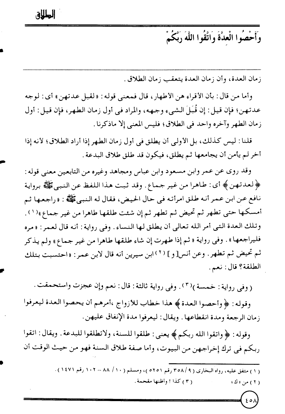 وَقد رُوِيَ عَن عمر وَابْن مَسْعُود وَابْن عَبَّاس وَمُجاهد وَغَيره من التَّابِعين معنى قَوْله: {لعدتهن} أَي: طَاهِرا من غير جماع. وَقد ثَبت هَذَا اللَّفْظ عَن النَّبِي بِرِوَايَة نَافِع عَن ابْن عمر أَنه طلق امْرَأَته فِي حَال الْحيض، فَقَالَ لَهُ النَّبِي: " رَاجعهَا ثمَّ أمْسكهَا حَتَّى تطهر ثمَّ تحيض ثمَّ تطهر ثمَّ إِن شِئْت طَلقهَا طَاهِرا من غير جماع ". وَتلك الْعدة الَّتِي أَمر الله تَعَالَى أَن يُطلق لَهَا النِّسَاء. وَفِي رِوَايَة: أَنه قَالَ لعمر: " مره فَلْيُرَاجِعهَا ". وَفِي رِوَايَة " ثمَّ إِذا طهرت إِن شَاءَ طَلقهَا طَاهِرا من غير جماع " وَلم يذكر ثمَّ تحيض ثمَّ تطهر. وَعَن أنس [و] ابْن سِيرِين أَنه قَالَ لِابْنِ عمر: " احتسبت بِتِلْكَ الطَّلقَة؟ قَالَ: نعم.