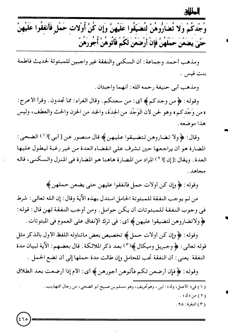 من لم يُوجب النَّفَقَة للمبتوتة الْحَامِل اسْتدلَّ بِهَذِهِ الْآيَة وَقَالَ: إِن الله تَعَالَى: شَرط فِي وجوب النَّفَقَة للمبتوتات أَن يكن حوامل. وَمن أوجب النَّفَقَة لَهُنَّ قَالَ: قَوْله: {وَلَا تضاروهن لتضيقوا عَلَيْهِنَّ} أَي: فِي ترك الْإِنْفَاق على الْعُمُوم فِي المبتوتات.