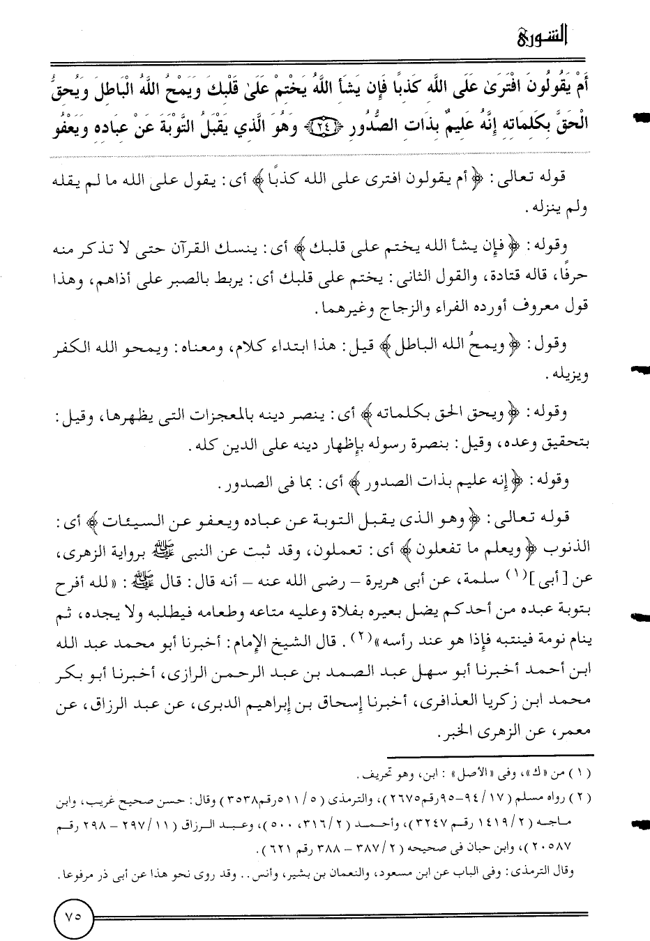 {أم يَقُولُونَ افترى على الله كذبا فَإِن يَشَأْ الله يخْتم على قَلْبك ويمح الله الْبَاطِل ويحق الْحق بكلماته إِنَّه عليم بِذَات الصُّدُور (24) وَهُوَ الَّذِي يقبل التَّوْبَة عَن عباده وَيَعْفُو}