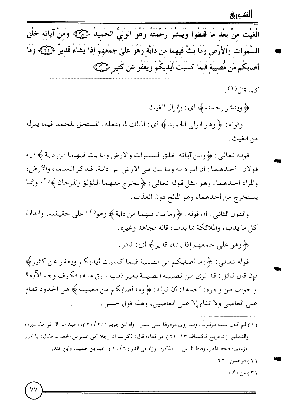 {الْغَيْث من بعد مَا قَنطُوا وينشر رَحمته وَهُوَ الْوَلِيّ الحميد (28) وَمن آيَاته خلق السَّمَوَات وَالْأَرْض وَمَا بَث فيهمَا من دَابَّة وَهُوَ على جمعهم إِذا يَشَاء قدير (29) وَمَا أَصَابَكُم من مُصِيبَة فبمَا كسبت أَيْدِيكُم وَيَعْفُو عَن كثير (30) } كَمَا قَالَ.
