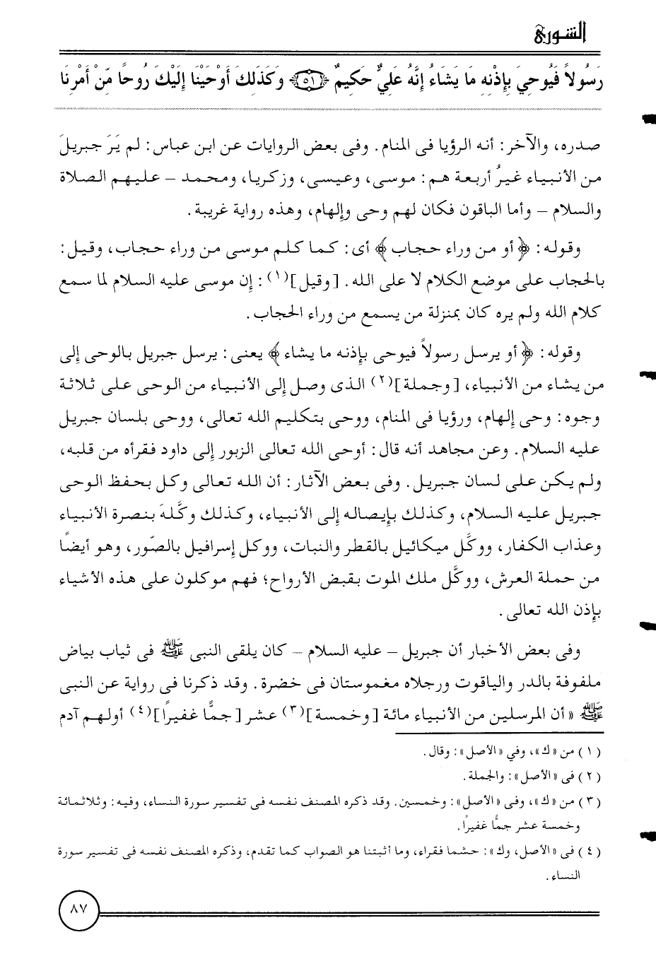 {رَسُولا فَيُوحِي بِإِذْنِهِ مَا يَشَاء إِنَّه عَليّ حَكِيم (51) وَكَذَلِكَ أَوْحَينَا إِلَيْك روحا من أمرنَا} صَدره، وَالْآخر: أَنه الرُّؤْيَا فِي الْمَنَام. وَفِي بعض الرِّوَايَات عَن ابْن عَبَّاس: لم ير جِبْرِيل من الْأَنْبِيَاء غير أَرْبَعَة هم: مُوسَى، وَعِيسَى، وزَكَرِيا، وَمُحَمّد عَلَيْهِم الصَّلَاة وَالسَّلَام وَأما الْبَاقُونَ فَكَانَ لَهُم وَحي وإلهام، وَهَذِه رِوَايَة غَرِيبَة.