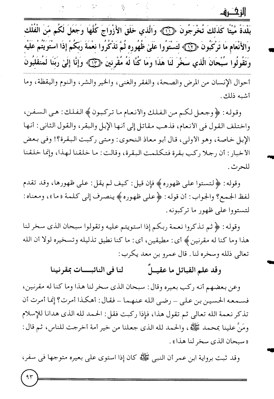 وَقَوله: {وَجعل لكم من الْفلك والأنعام مَا تَرْكَبُونَ} الْفلك: هِيَ السفن، وَاخْتلف القَوْل فِي الْأَنْعَام، فَذهب مقَاتل إِلَى أَنَّهَا الْإِبِل وَالْبَقر، وَالْقَوْل الثَّانِي: أَنَّهَا الْإِبِل خَاصَّة، وَهُوَ الأولى، قَالَ أَبُو معَاذ النَّحْوِيّ: وَمَتى ركبت الْبَقَرَة؟ ! وَفِي بعض الْأَخْبَار: أَن رجلا ركب بقرة فتكلمت الْبَقَرَة، وَقَالَت: مَا خلقنَا لهَذَا، وَإِنَّمَا خلقنَا للحرث.