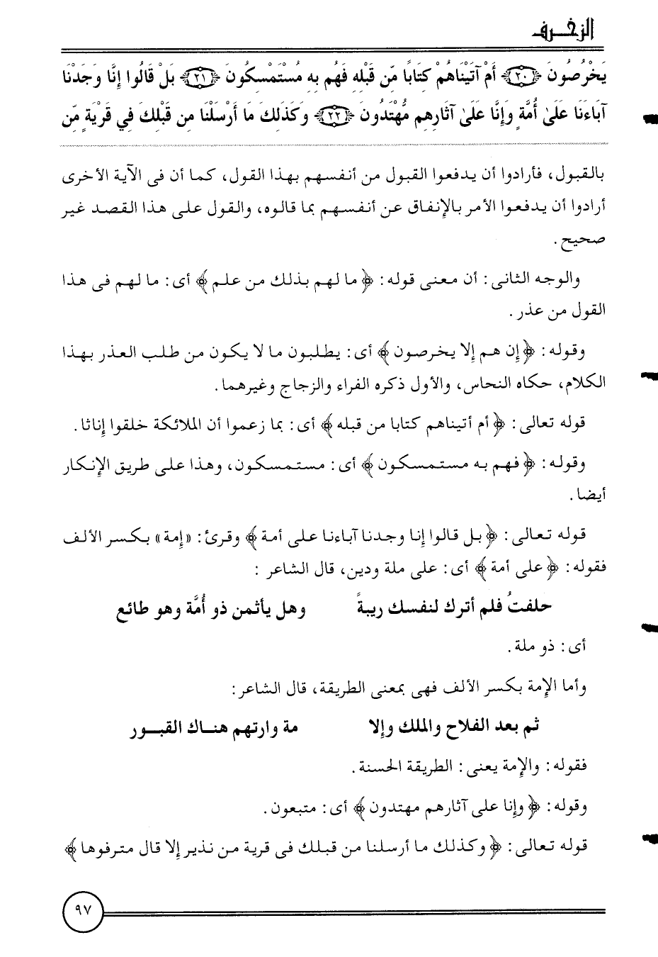 {يخرصون (20) أم آتَيْنَاهُم كتابا من قبله فهم بِهِ مستمسكون (21) بل قَالُوا إِنَّا وجدنَا آبَاءَنَا على أمة وَإِنَّا على آثَارهم مهتدون (22) وَكَذَلِكَ مَا أرسلنَا من قبلك فِي قَرْيَة من} بِالْقبُولِ، فأرادوا أَن يدفعوا الْقبُول من أنفسهم بِهَذَا القَوْل، كَمَا أَن فِي الْآيَة الآخرى أَرَادوا أَن يدفعوا الْأَمر بِالْإِنْفَاقِ عَن أنفسهم بِمَا قَالُوهُ، وَالْقَوْل على هَذَا الْقَصْد غير صَحِيح.