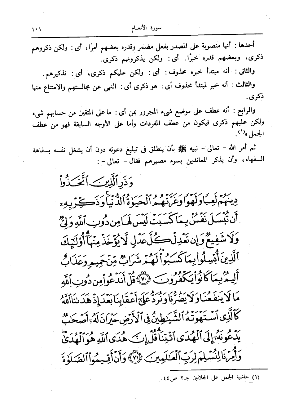 والرابع: أنه عطف على موضع شيء المجرور بمن أى: ما على المتقين من حسابهم شيء ولكن عليهم ذكرى فيكون من عطف المفردات وأما على الأوجه السابقة فهو من عطف الجمل» «1» .