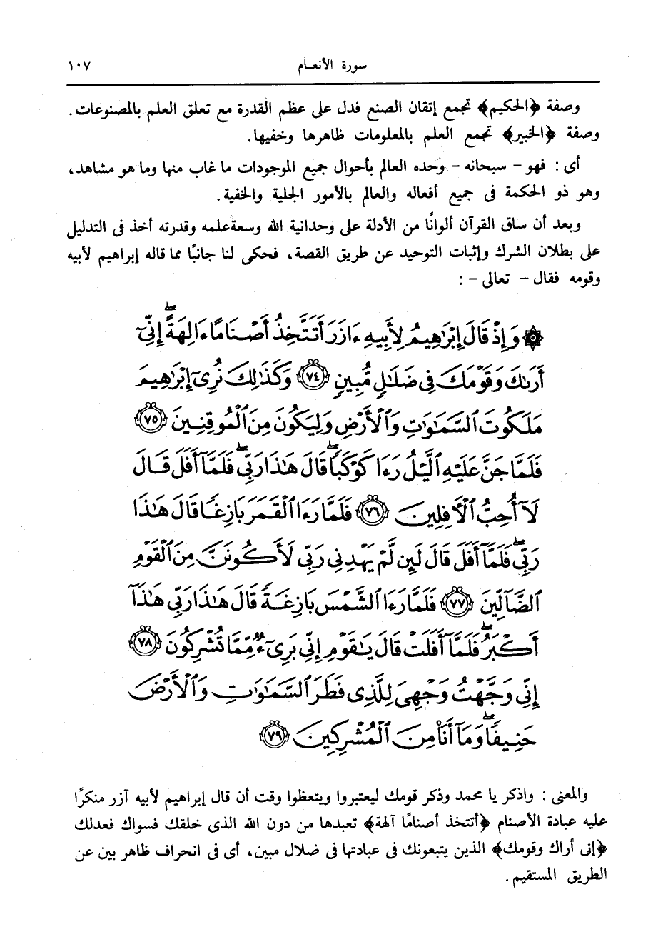 وَإِذْ قالَ إِبْراهِيمُ لِأَبِيهِ آزَرَ أَتَتَّخِذُ أَصْناماً آلِهَةً إِنِّي أَراكَ وَقَوْمَكَ فِي ضَلالٍ مُبِينٍ (74) وَكَذلِكَ نُرِي إِبْراهِيمَ مَلَكُوتَ السَّماواتِ وَالْأَرْضِ وَلِيَكُونَ مِنَ الْمُوقِنِينَ (75) فَلَمَّا جَنَّ عَلَيْهِ اللَّيْلُ رَأى كَوْكَباً قالَ هذا رَبِّي فَلَمَّا أَفَلَ قالَ لا أُحِبُّ الْآفِلِينَ (76) فَلَمَّا رَأَى الْقَمَرَ بازِغاً قالَ هذا رَبِّي فَلَمَّا أَفَلَ قالَ لَئِنْ لَمْ يَهْدِنِي رَبِّي لَأَكُونَنَّ مِنَ الْقَوْمِ الضَّالِّينَ (77) فَلَمَّا رَأَى الشَّمْسَ بازِغَةً قالَ هذا رَبِّي هذا أَكْبَرُ فَلَمَّا أَفَلَتْ قالَ يا قَوْمِ إِنِّي بَرِيءٌ مِمَّا تُشْرِكُونَ (78)