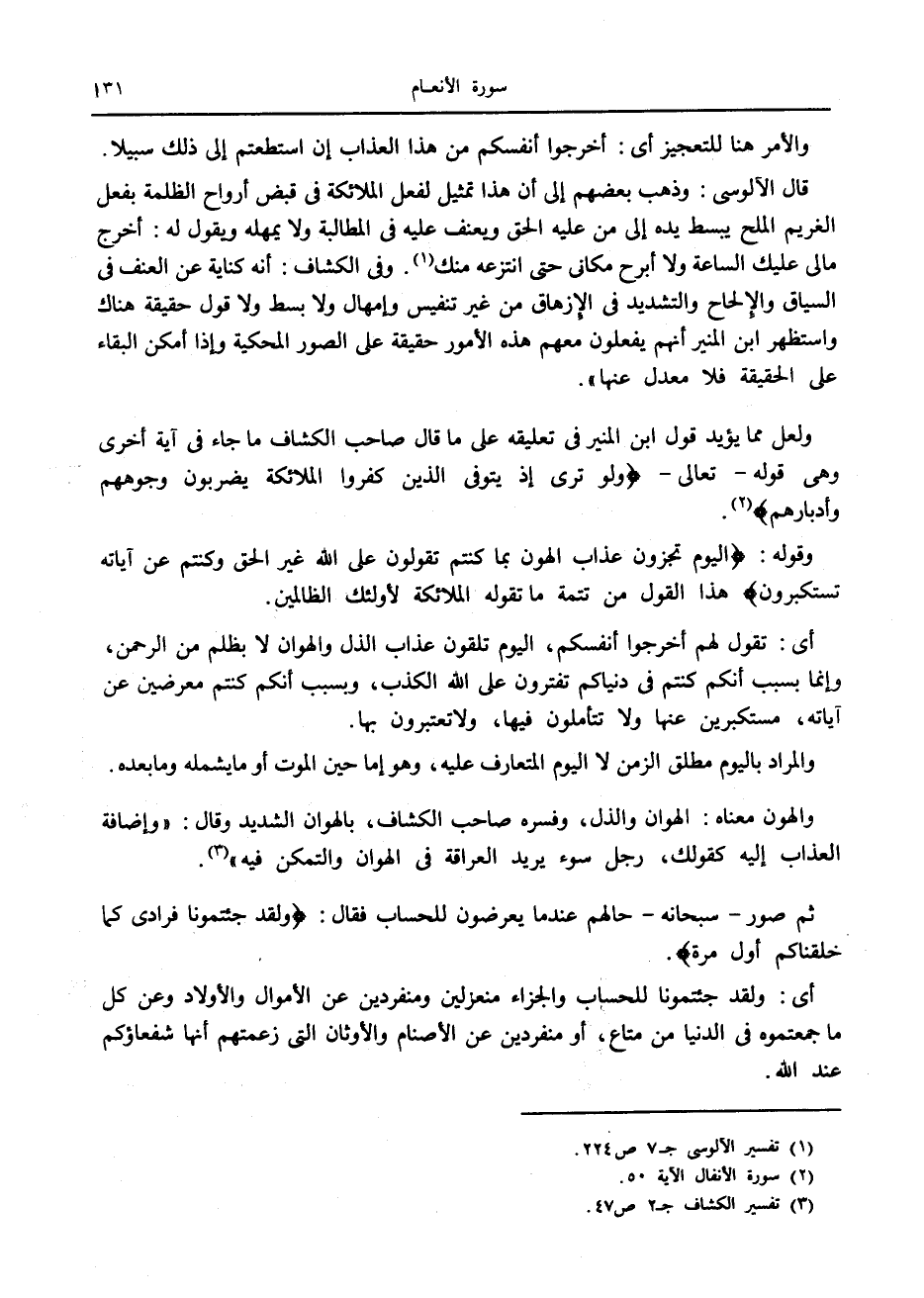 قال الآلوسى: وذهب بعضهم إلى أن هذا تمثيل لفعل الملائكة في قبض أرواح الظلمة بفعل الغريم الملح يبسط يده إلى من عليه الحق ويعنف عليه في المطالبة ولا يمهله ويقول له: أخرج مالي عليك الساعة ولا أبرح مكاني حتى انتزعه منك «1» . وفي الكشاف: أنه كناية عن العنف في السياق والإلحاح والتشديد في الإزهاق من غير تنفيس وإمهال ولا بسط ولا قول حقيقة هناك واستظهر ابن المنير أنهم يفعلون معهم هذه الأمور حقيقة على الصور المحكية وإذا أمكن البقاء على الحقيقة فلا معدل عنها» .