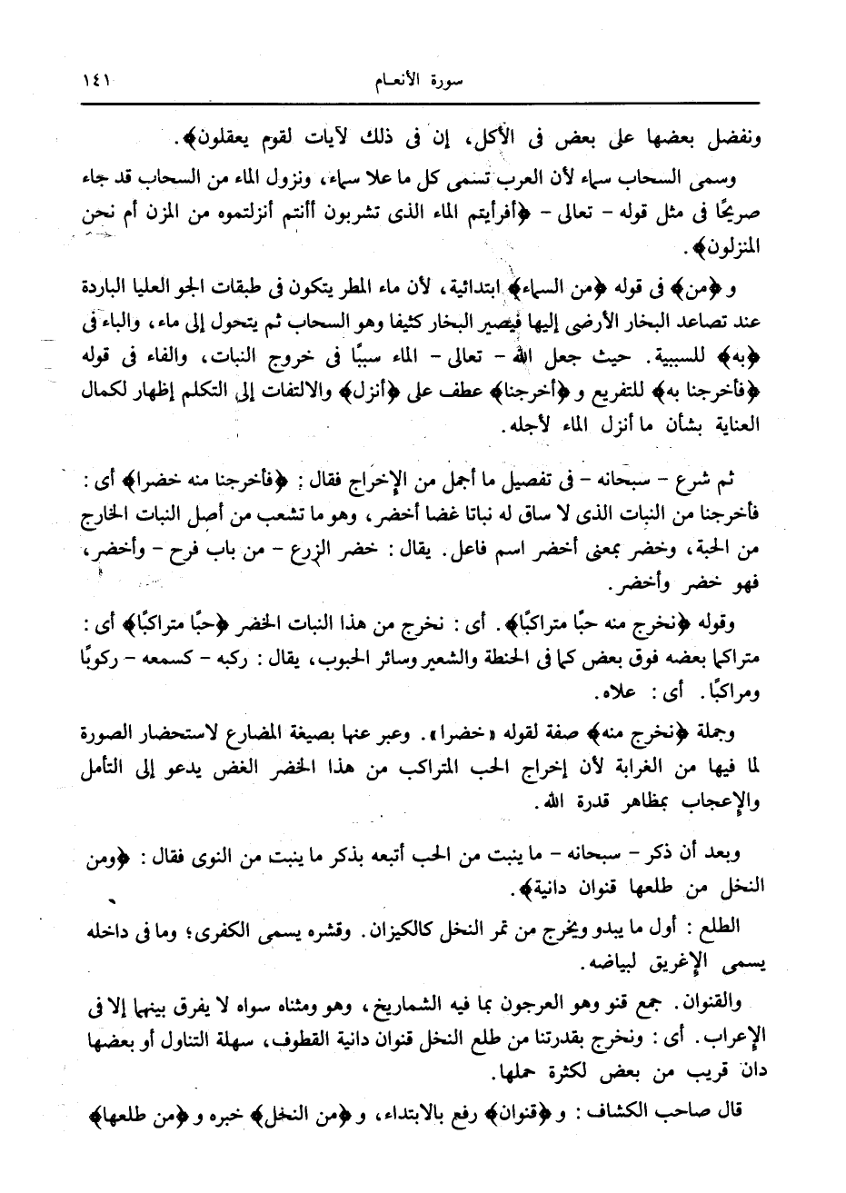 ومِنَ في قوله مِنَ السَّماءِ ابتدائية، لأن ماء المطر يتكون في طبقات الجو العليا الباردة عند تصاعد البخار الأرضى إليها فيصير البخار كثيفا وهو السحاب ثم يتحول إلى ماء، والباء في بِهِ للسببية. حيث جعل الله- تعالى- الماء سببا في خروج النبات، والفاء في قوله فَأَخْرَجْنا بِهِ للتفريع وفَأَخْرَجْنا عطف على أَنْزَلَ والالتفات إلى التكلم إظهار لكمال العناية بشأن ما أنزل الماء لأجله.