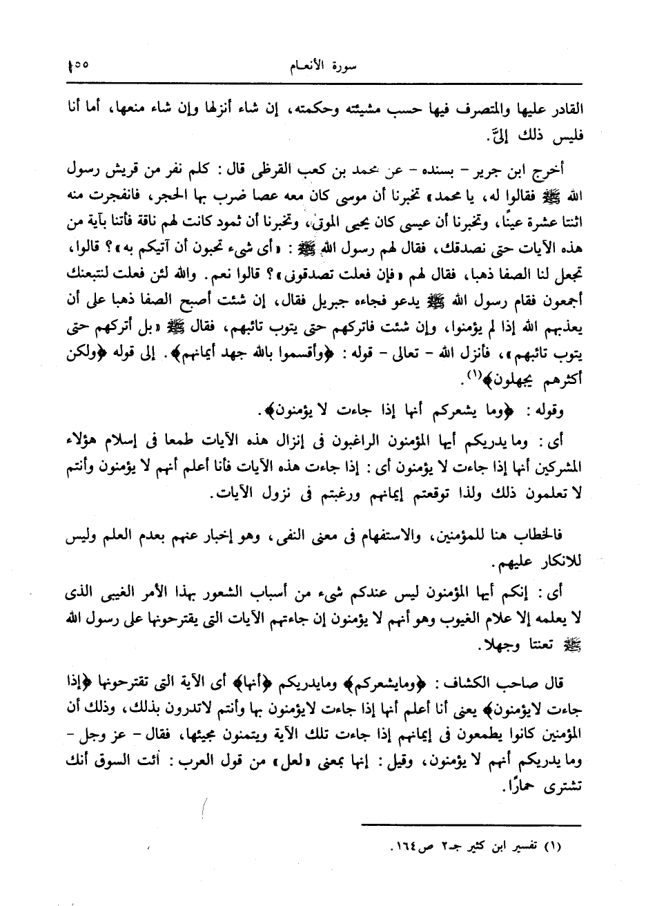 قال صاحب الكشاف: وَما يُشْعِرُكُمْ وما يدريكم أَنَّها أى الآية التي تقترحونها إِذا جاءَتْ لا يُؤْمِنُونَ يعنى أنا أعلم أنها إذا جاءت لا يؤمنون بها وأنتم لا تدرون بذلك، وذلك أن المؤمنين كانوا يطمعون في إيمانهم إذا جاءت تلك الآية ويتمنون مجيئها، فقال- عز وجل- وما يدريكم أنهم لا يؤمنون، وقيل: إنها بمعنى «لعل» من قول العرب: ائت السوق أنك تشترى حمارا.