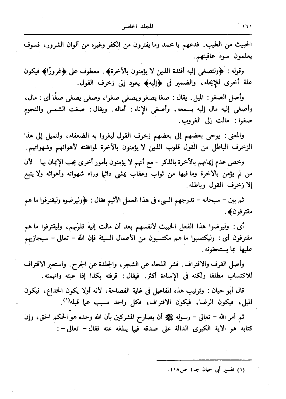 وقوله: وَلِتَصْغى إِلَيْهِ أَفْئِدَةُ الَّذِينَ لا يُؤْمِنُونَ بِالْآخِرَةِ. معطوف على غُرُوراً فيكون علة أخرى للإيحاء، والضمير في إِلَيْهِ يعود إلى زخرف القول.