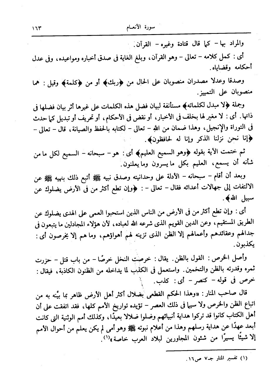 قال صاحب المنار: «وهذا الحكم القطعي بضلال أكثر أهل الأرض ظاهر بما بيّنه به من اتباع الظن والخرص ولا سيما في ذلك العصر- تؤيده تواريخ الأمم كلها، فقد اتفقت على أن أهل الكتاب كانوا قد تركوا هداية أنبيائهم وضلوا ضلالا بعيدا، وكذلك أمم الوثنية التي كانت أبعد عهدا عن هداية رسلهم وهذا من أعلام نبوته صلى الله عليه وسلم وهو أمى لم يكن يعلم من أحوال الأمم إلا شيئا يسيرا من شئون المجاورين لبلاد العرب خاصة» «1» .