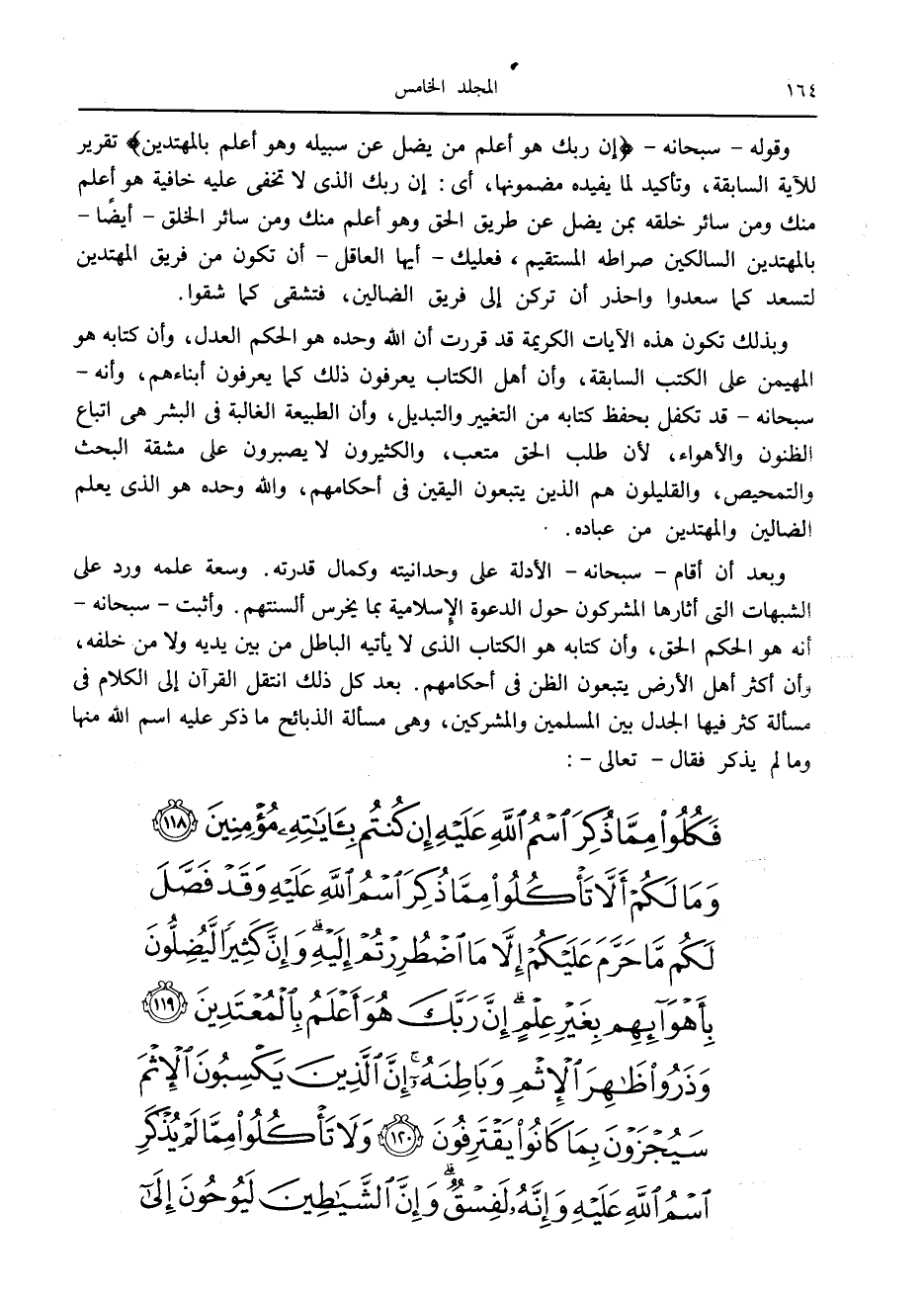 وبعد أن أقام- سبحانه- الأدلة على وحدانيته وكمال قدرته. وسعة علمه ورد على الشبهات التي أثارها المشركون حول الدعوة الإسلامية بما يخرس ألسنتهم. وأثبت- سبحانه- أنه هو الحكم الحق، وأن كتابه هو الكتاب الذي لا يأتيه الباطل من بين يديه ولا من خلقه، وأن أكثر أهل الأرض يتبعون الظن في أحكامهم. بعد كل ذلك انتقل القرآن إلى الكلام في مسألة كثر فيها الجدل بين المسلمين والمشركين، وهي مسألة الذبائح ما ذكر عليه اسم الله منها وما لم يذكر فقال- تعالى-:
