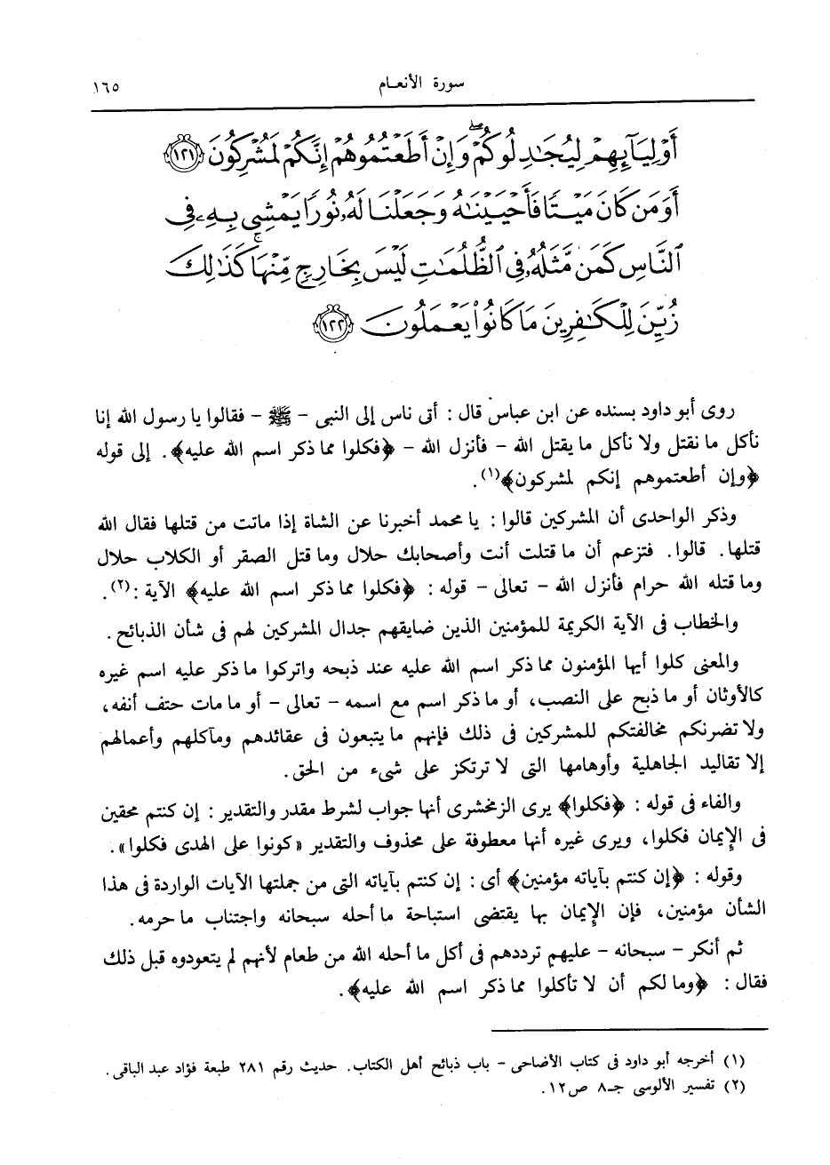 روى أبو داود بسنده عن ابن عباس قال: أتى ناس إلى النبي صلى الله عليه وسلم فقالوا يا رسول الله إنا نأكل ما نقتل ولا نأكل ما يقتل الله- فأنزل الله- فَكُلُوا مِمَّا ذُكِرَ اسْمُ اللَّهِ عَلَيْهِ. إلى قوله وَإِنْ أَطَعْتُمُوهُمْ إِنَّكُمْ لَمُشْرِكُونَ «1» .