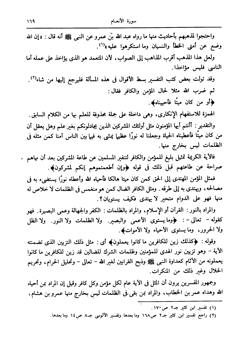 فمثل المؤمن المهتدى إلى الحق كمن كان ميتا هالكا فأحياه الله وأعطاه نورا يستضيء به في مصالحه، ويهتدى به إلى طرقه. ومثل الكافر الضال كمن هو منغمس في الظلمات لا خلاص له منها فهو على الدوام متحير لا يهتدى فكيف يستويان؟.