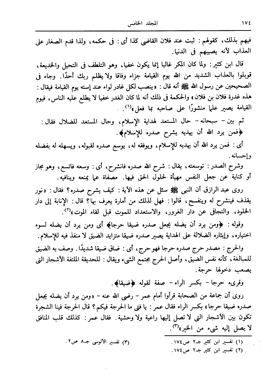 وقوله: وَمَنْ يُرِدْ أَنْ يُضِلَّهُ يَجْعَلْ صَدْرَهُ ضَيِّقاً حَرَجاً أى ومن يرد أن يضله لسوء اختياره، وإيثاره الضلالة على الهداية يصير صدره ضيقا متزايد الضيق لا منفذ فيه للإسلام.