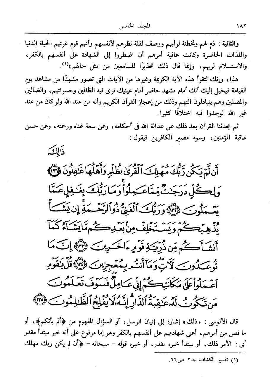 ذلِكَ أَنْ لَمْ يَكُنْ رَبُّكَ مُهْلِكَ الْقُرى بِظُلْمٍ وَأَهْلُها غافِلُونَ (131) وَلِكُلٍّ دَرَجاتٌ مِمَّا عَمِلُوا وَما رَبُّكَ بِغافِلٍ عَمَّا يَعْمَلُونَ (132) وَرَبُّكَ الْغَنِيُّ ذُو الرَّحْمَةِ إِنْ يَشَأْ يُذْهِبْكُمْ وَيَسْتَخْلِفْ مِنْ بَعْدِكُمْ ما يَشاءُ كَما أَنْشَأَكُمْ مِنْ ذُرِّيَّةِ قَوْمٍ آخَرِينَ (133) إِنَّ ما تُوعَدُونَ لَآتٍ وَما أَنْتُمْ بِمُعْجِزِينَ (134) قُلْ يا قَوْمِ اعْمَلُوا عَلى مَكانَتِكُمْ إِنِّي عامِلٌ فَسَوْفَ تَعْلَمُونَ مَنْ تَكُونُ لَهُ عاقِبَةُ الدَّارِ إِنَّهُ لا يُفْلِحُ الظَّالِمُونَ (135)