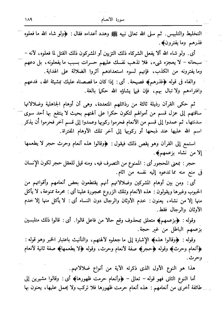 أما النوع الثاني فهو قوله- تعالى- وَأَنْعامٌ حُرِّمَتْ ظُهُورُها أى: وقالوا مشيرين إلى طائفة أخرى من أنعامهم: هذه أنعام حرمت ظهورها فلا تركب ولا يحمل عليها، يعنون بها