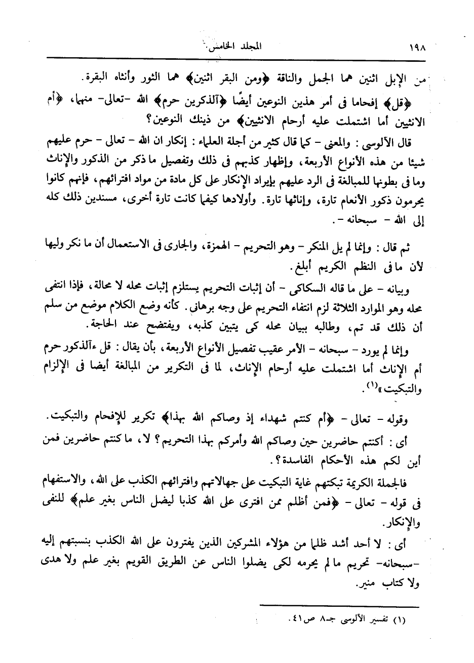 قال الآلوسى: والمعنى- كما قال كثير من أجلة العلماء: إنكار ان الله- تعالى- حرم عليهم شيئا من هذه الأنواع الأربعة، وإظهار كذبهم في ذلك وتفصيل ما ذكر من الذكور والإناث وما في بطونها للمبالغة في الرد عليهم بإيراد الإنكار على كل مادة من مواد افترائهم، فإنهم كانوا يحرمون ذكور الأنعام تارة، وإناثها تارة. وأولادها كيفما كانت تارة أخرى، مسندين ذلك كله إلى الله- سبحانه-.