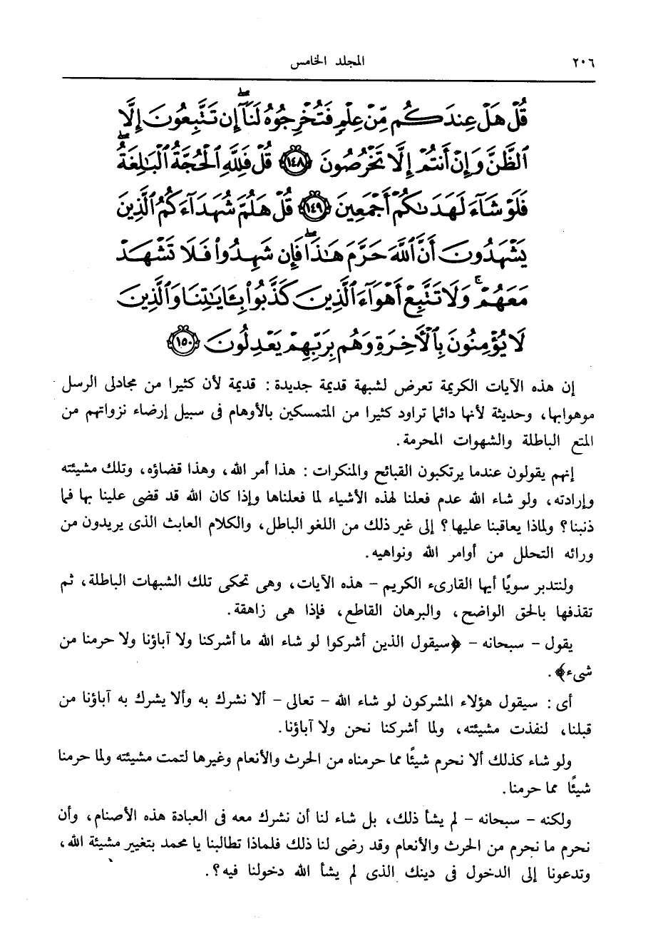 سَيَقُولُ الَّذِينَ أَشْرَكُوا لَوْ شاءَ اللَّهُ ما أَشْرَكْنا وَلا آباؤُنا وَلا حَرَّمْنا مِنْ شَيْءٍ كَذلِكَ كَذَّبَ الَّذِينَ مِنْ قَبْلِهِمْ حَتَّى ذاقُوا بَأْسَنا قُلْ هَلْ عِنْدَكُمْ مِنْ عِلْمٍ فَتُخْرِجُوهُ لَنا إِنْ تَتَّبِعُونَ إِلاَّ الظَّنَّ وَإِنْ أَنْتُمْ إِلاَّ تَخْرُصُونَ (148) قُلْ فَلِلَّهِ الْحُجَّةُ الْبالِغَةُ فَلَوْ شاءَ لَهَداكُمْ أَجْمَعِينَ (149) قُلْ هَلُمَّ شُهَداءَكُمُ الَّذِينَ يَشْهَدُونَ أَنَّ اللَّهَ حَرَّمَ هذا فَإِنْ شَهِدُوا فَلا تَشْهَدْ مَعَهُمْ وَلا تَتَّبِعْ أَهْواءَ الَّذِينَ كَذَّبُوا بِآياتِنا وَالَّذِينَ لا يُؤْمِنُونَ بِالْآخِرَةِ وَهُمْ بِرَبِّهِمْ يَعْدِلُونَ (150)