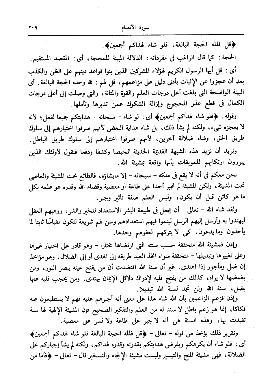 وتقرير ذلك يؤخذ من قوله- تعالى- قُلْ فَلِلَّهِ الْحُجَّةُ الْبالِغَةُ فَلَوْ شاءَ لَهَداكُمْ أَجْمَعِينَ أى: فلو شاء أن يكرهكم ويفرض هدايتكم بقدرته وقدره لهداكم، ولكنه لم يشأ إجباركم على الضلالة، فهي مشيئة المنح والتيسير وليست مشيئة الإلجاء والتسخير قال- تعالى- فَأَمَّا مَنْ