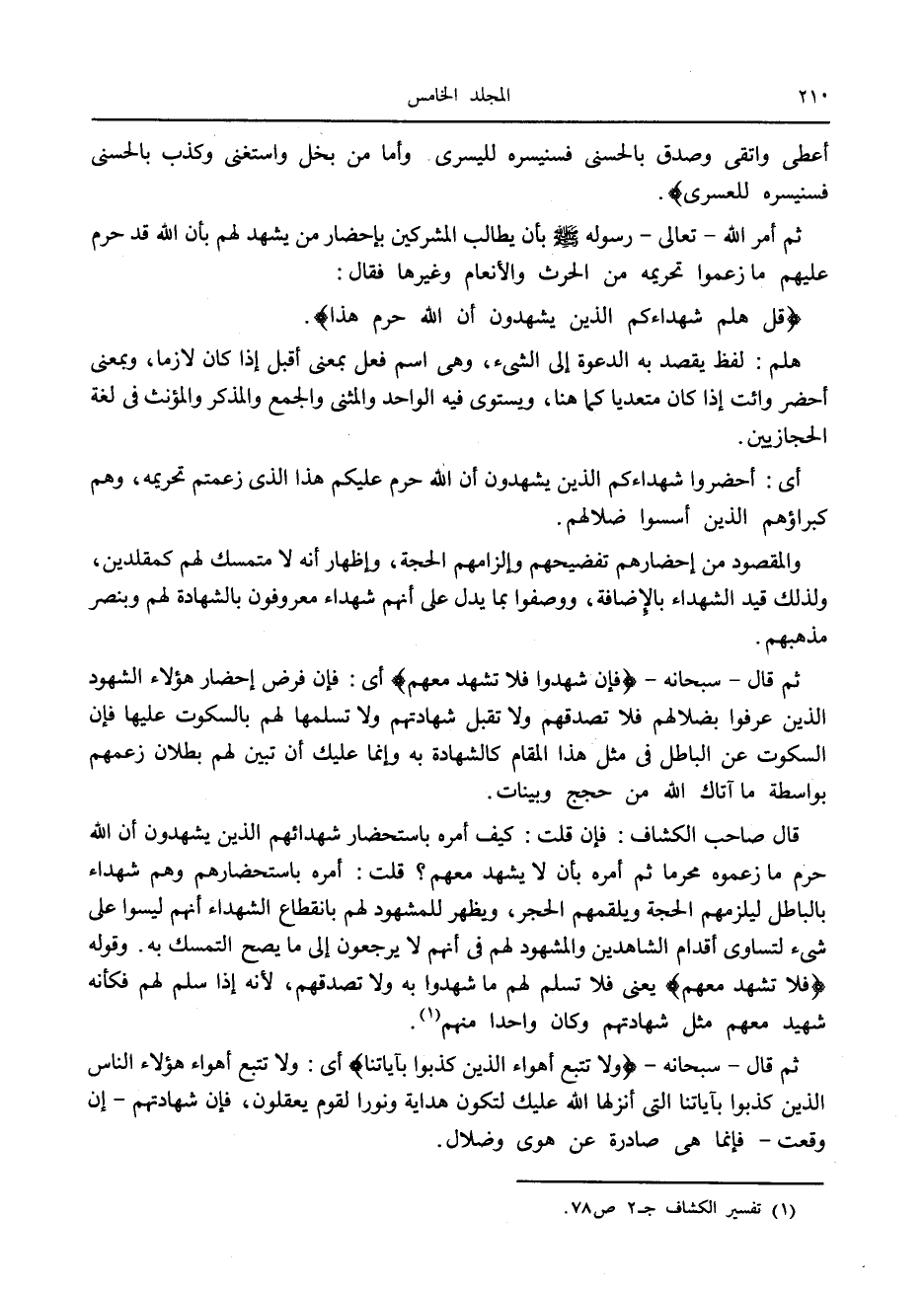 قال صاحب الكشاف: فإن قلت: كيف أمره باستحضار شهدائهم الذين يشهدون أن الله حرم ما زعموه محرما ثم أمره بأن لا يشهد معهم؟ قلت: أمره باستحضارهم وهم شهداء بالباطل ليلزمهم الحجة ويلقمهم الحجر، ويظهر للمشهود لهم بانقطاع الشهداء أنهم ليسوا على شيء لتساوى أقدام الشاهدين والمشهود لهم في أنهم لا يرجعون إلى ما يصح التمسك به. وقوله فَلا تَشْهَدْ مَعَهُمْ يعنى فلا تسلم لهم ما شهدوا به ولا تصدقهم، لأنه إذا سلم لهم فكأنه شهيد معهم مثل شهادتهم وكان واحدا منهم «1» .