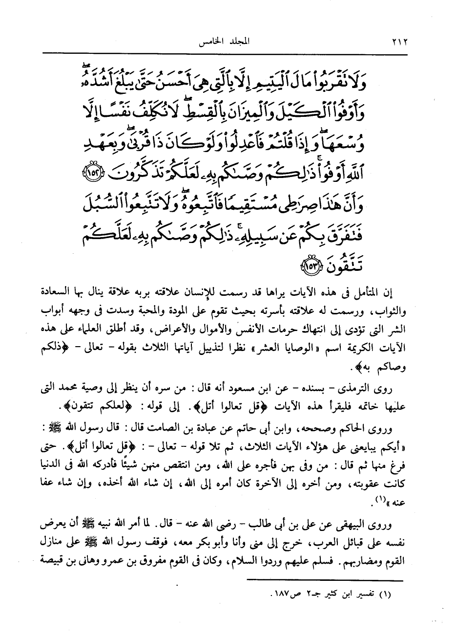 روى الترمذي- بسنده- عن ابن مسعود أنه قال: من سره أن ينظر إلى وصية محمد التي عليها خاتمه فليقرأ هذه الآيات قُلْ تَعالَوْا أَتْلُ. إلى قوله: لَعَلَّكُمْ تَتَّقُونَ.