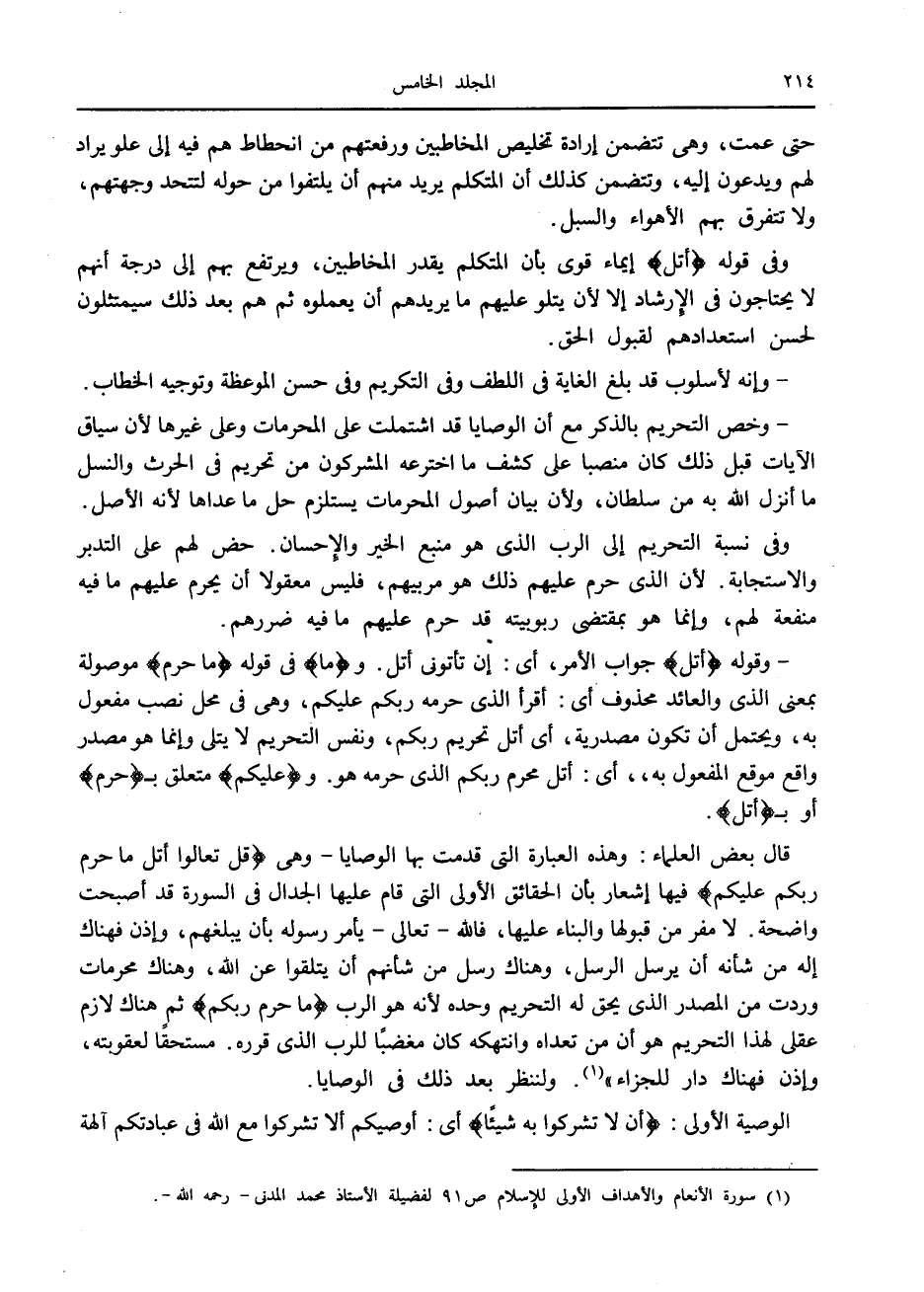 (1) سورة الأنعام والأهداف الأولى للإسلام ص 91 لفضيلة الأستاذ محمد المدني- رحمه الله-.