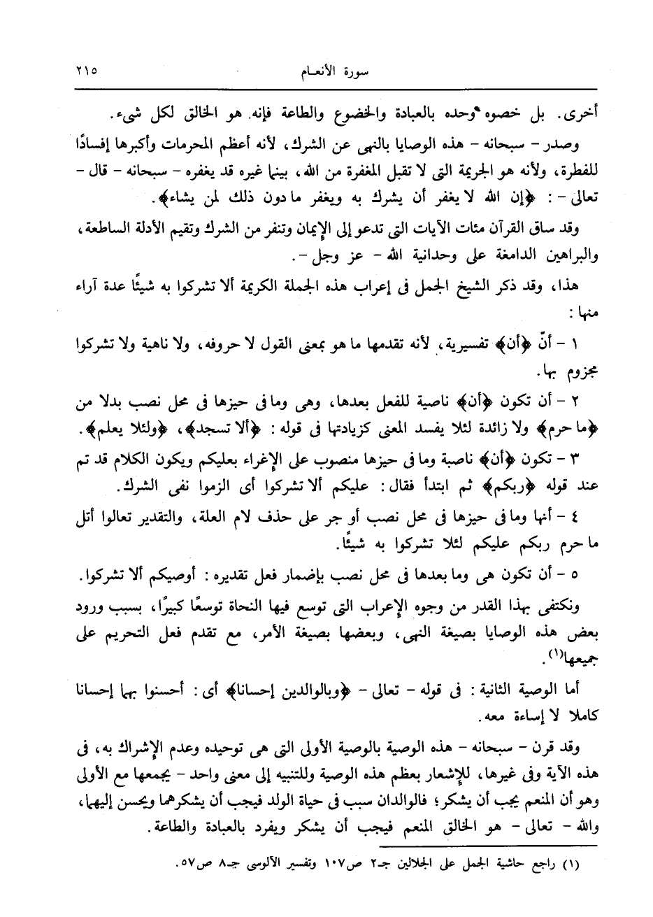 هذا، وقد ذكر الشيخ الجمل في إعراب هذه الجملة الكريمة ألا تشركوا به شيئا عدة آراء منها: