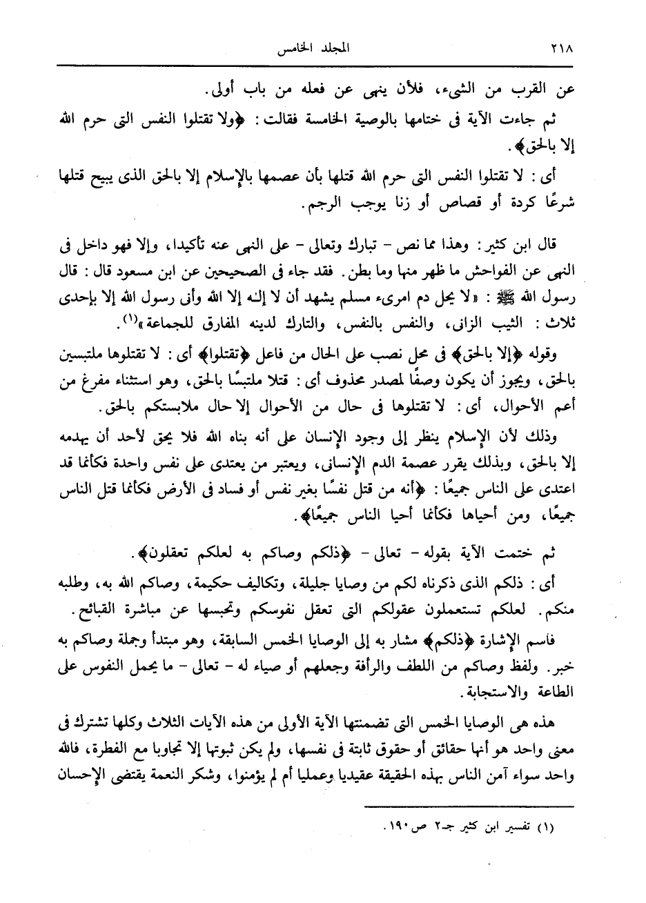 ثم جاءت الآية في ختامها بالوصية الخامسة فقالت: وَلا تَقْتُلُوا النَّفْسَ الَّتِي حَرَّمَ اللَّهُ إِلَّا بِالْحَقِّ.