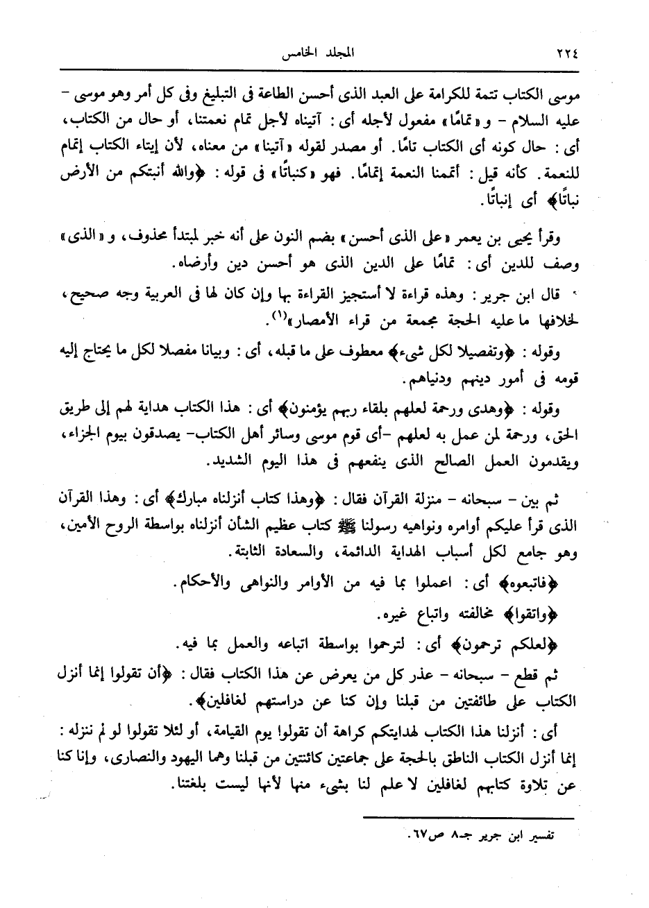موسى الكتاب تتمة للكرامة على العبد الذي أحسن الطاعة في التبليغ وفي كل أمر وهو موسى- عليه السلام- و «تماما» مفعول لأجله أى: آتيناه لأجل تمام نعمتنا، أو حال من الكتاب، أى: حال كونه أى الكتاب تاما. أو مصدر لقوله «آتينا» من معناه، لأن إيتاء الكتاب إتمام للنعمة. كأنه قيل: أتممنا النعمة إتماما. فهو «كنباتا» في قوله: وَاللَّهُ أَنْبَتَكُمْ مِنَ الْأَرْضِ نَباتاً أى إنباتا.