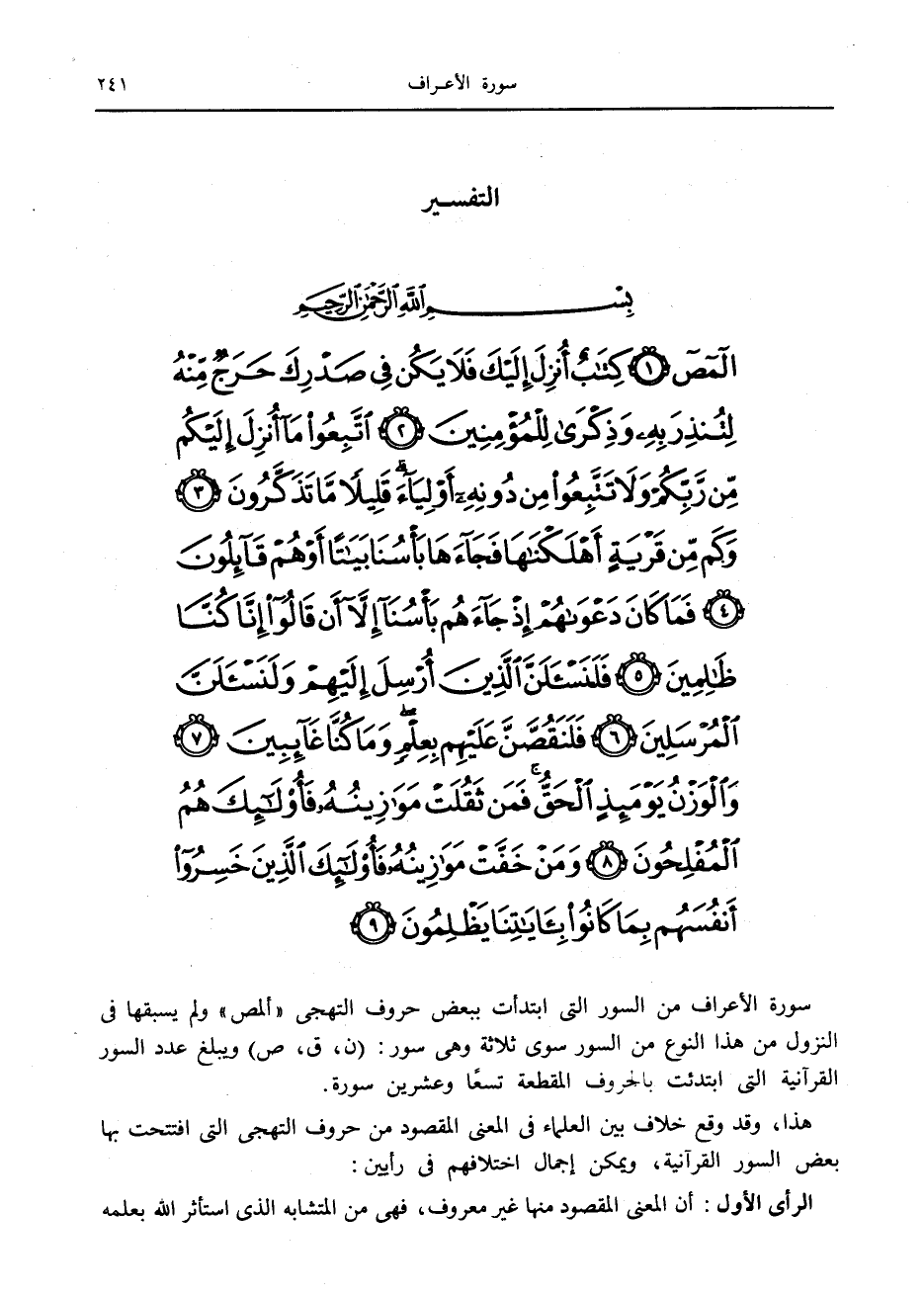 المص (1) كِتابٌ أُنْزِلَ إِلَيْكَ فَلا يَكُنْ فِي صَدْرِكَ حَرَجٌ مِنْهُ لِتُنْذِرَ بِهِ وَذِكْرى لِلْمُؤْمِنِينَ (2) اتَّبِعُوا ما أُنْزِلَ إِلَيْكُمْ مِنْ رَبِّكُمْ وَلا تَتَّبِعُوا مِنْ دُونِهِ أَوْلِياءَ قَلِيلاً ما تَذَكَّرُونَ (3) وَكَمْ مِنْ قَرْيَةٍ أَهْلَكْناها فَجاءَها بَأْسُنا بَياتاً أَوْ هُمْ قائِلُونَ (4)