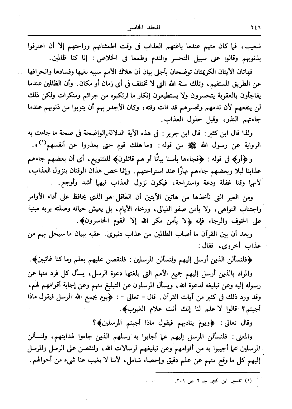 ولذا قال ابن كثير: قال ابن جرير: في هذه الآية الدلالة الواضحة في صحة ما جاءت به الرواية عن رسول الله صلى الله عليه وسلم من قوله: «ما هلك قوم حتى يعذروا عن أنفسهم «1» » .